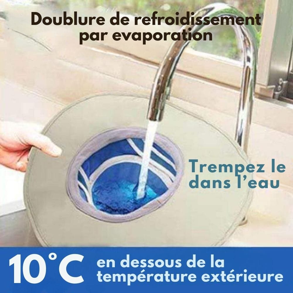 Il suffit de mouiller légèrement l’intérieur pour que le chapeau diffuse un effet frais, sans sensation d’humidité désagréable. Résultat : vous vous sentez plus léger, plus à l’aise, même par temps chaud.