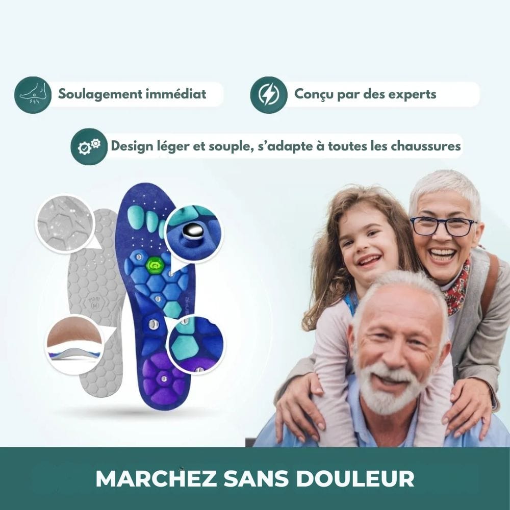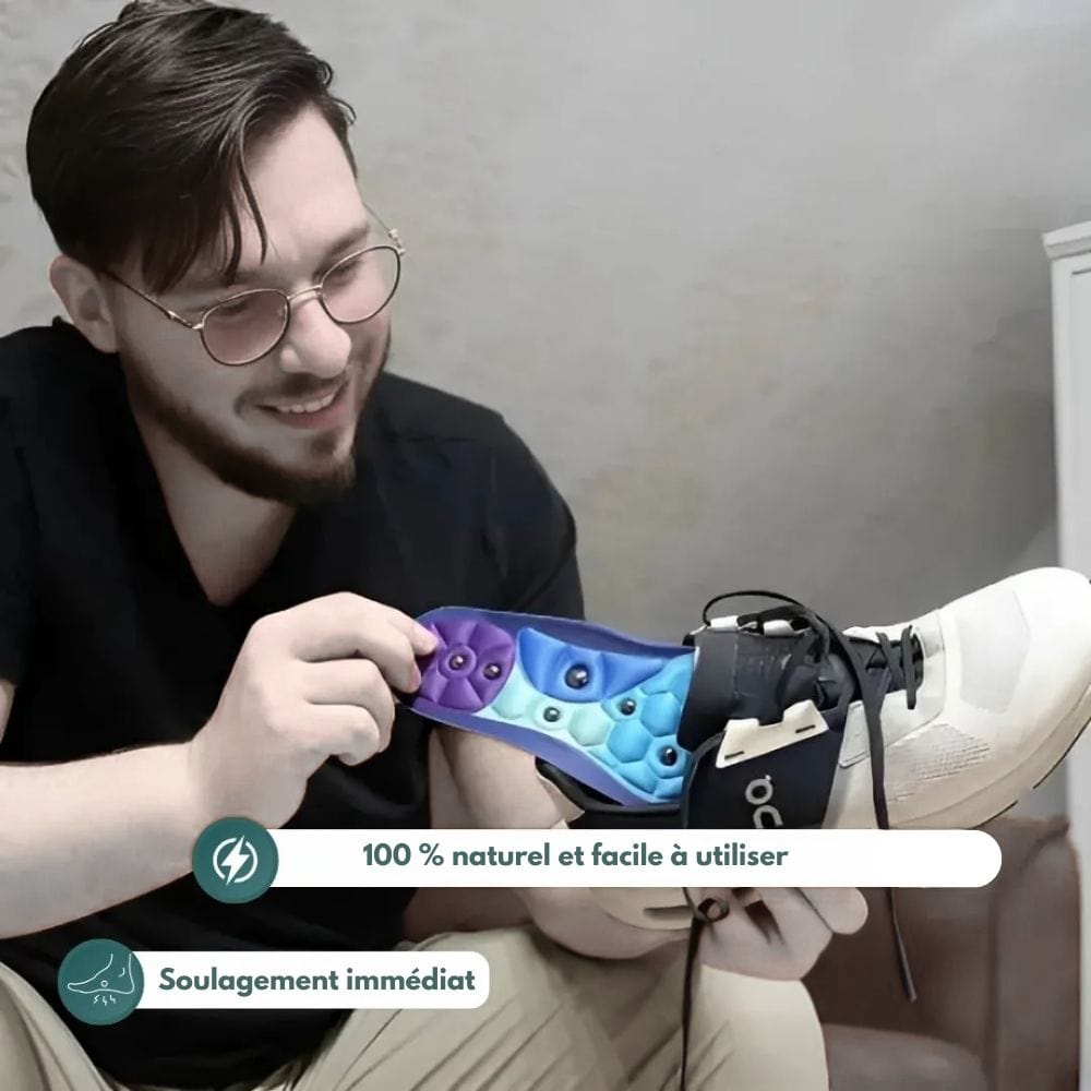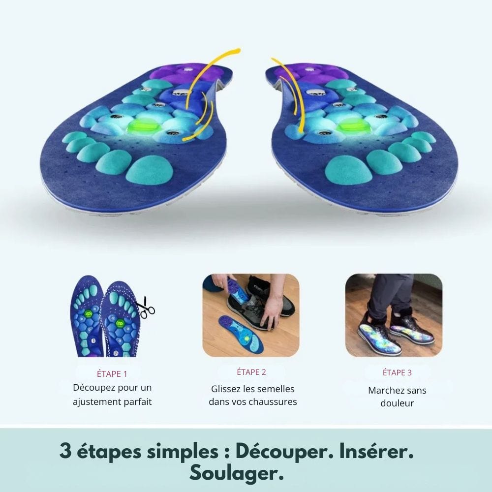 Les semelles sont équipées de points de massage et d’aimants thérapeutiques, qui exercent une légère pression sur des zones clés du pied. C’est comme un massage discret à chaque pas. Et le mieux ? Elles sont ultra fines, s’adaptent à toutes vos chaussures et peuvent être découpées à la taille exacte. Vous n'avez rien à changer à votre routine, juste à les insérer dans vos baskets, chaussures de ville ou bottines.