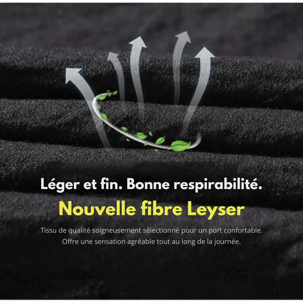 Le tissu Ice Silk apporte une sensation de fraîcheur immédiate, même en plein été. Sa fibre légère et respirante évacue la chaleur, limite la transpiration et garde ta peau au sec. Avec ses propriétés thermorégulatrices, il te permet de rester à l’aise tout au long de la journée, même sous 30°C.