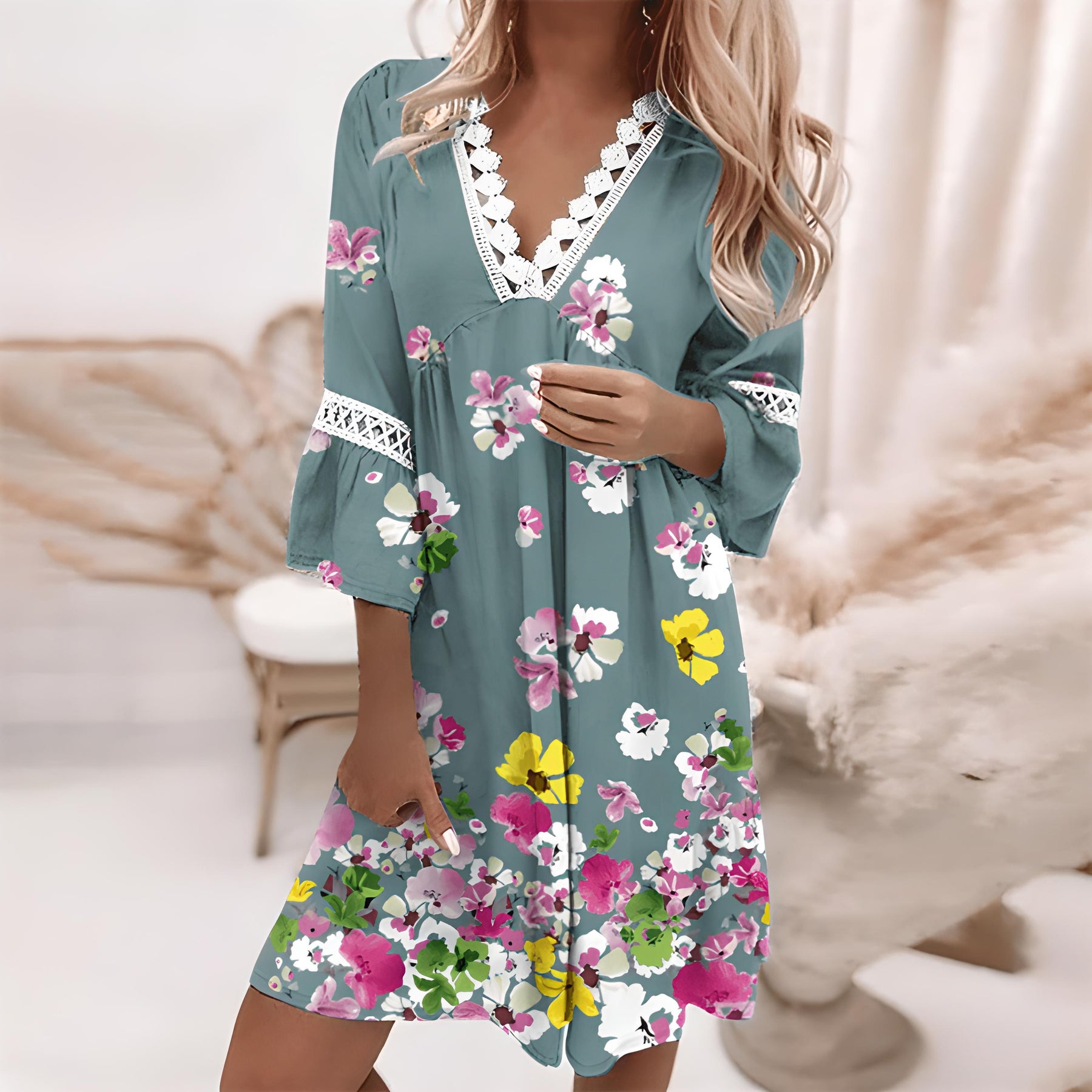 Aglaé | Robe Fleurie d’Été à Manches Évasées – Col V, Tissu Doux et Dentelle Fine – Coupe Décontractée Féminine