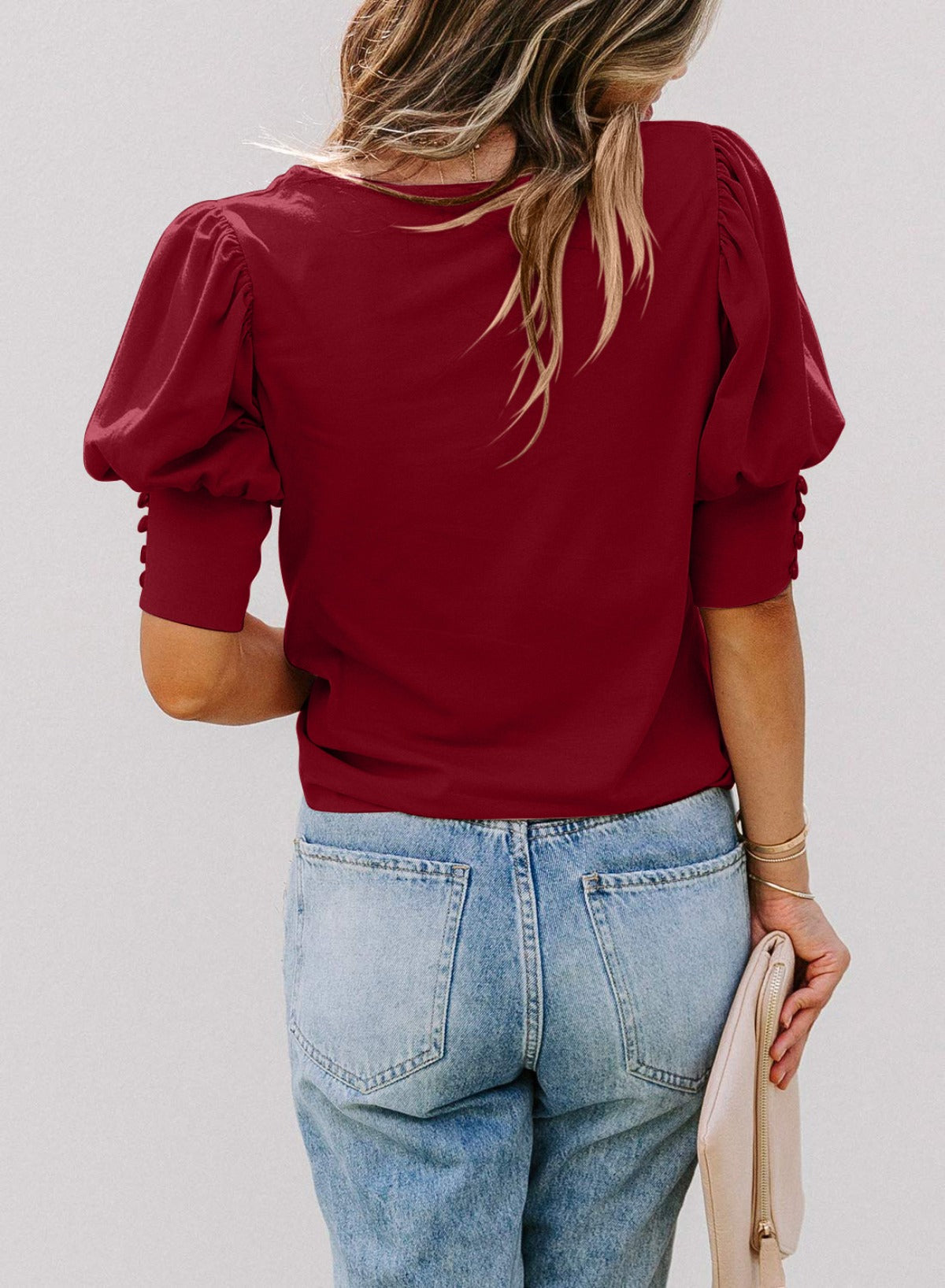 Agneline | Blouse Femme Unie Col Rond avec Manches Bouffantes – Chemisier Classique d’Été