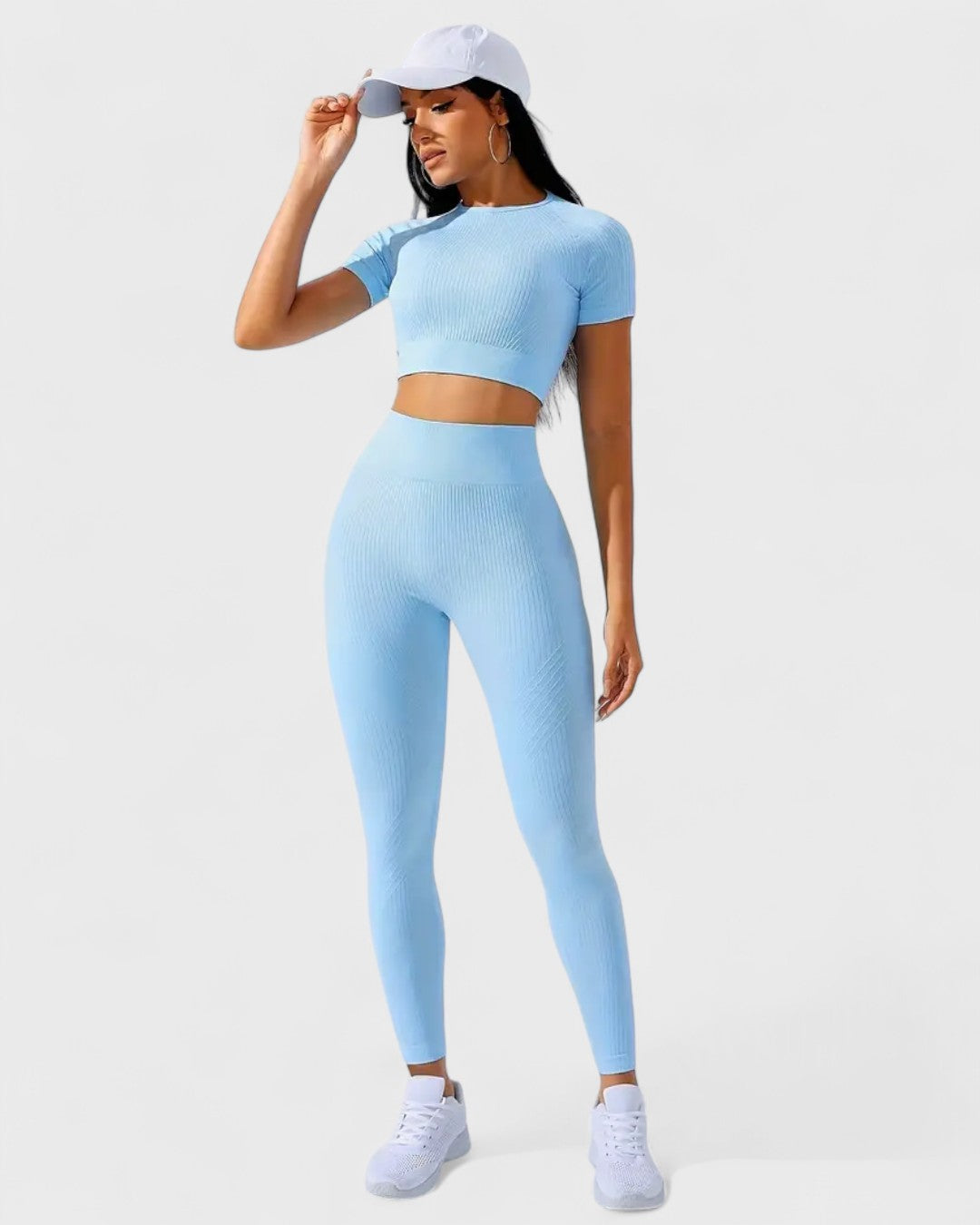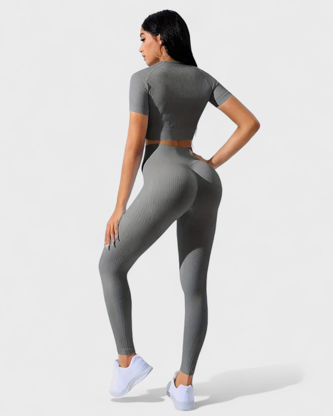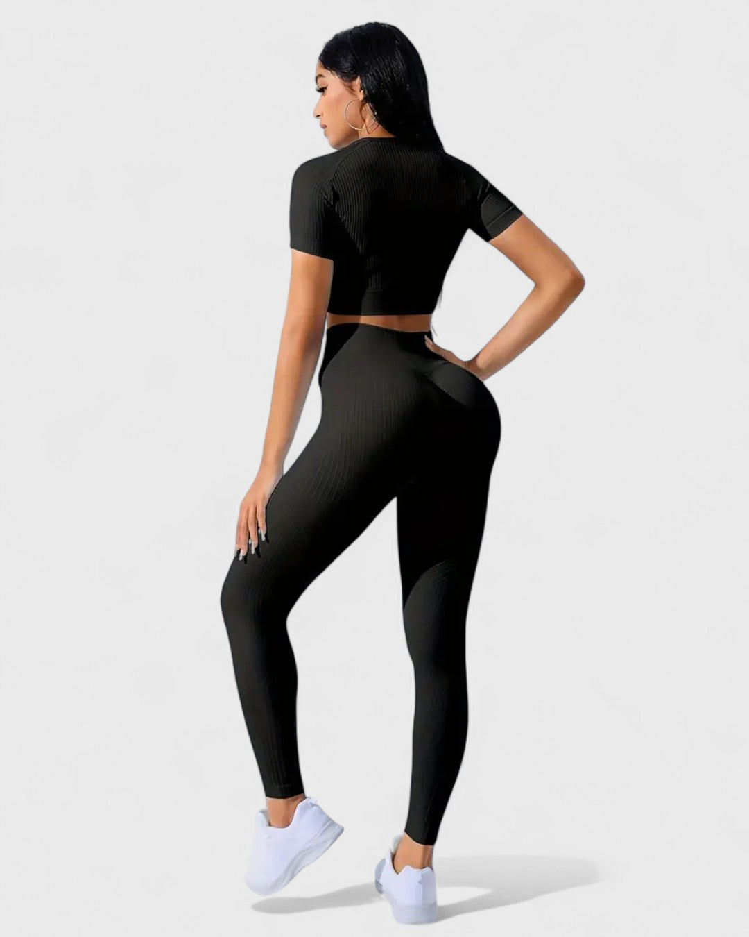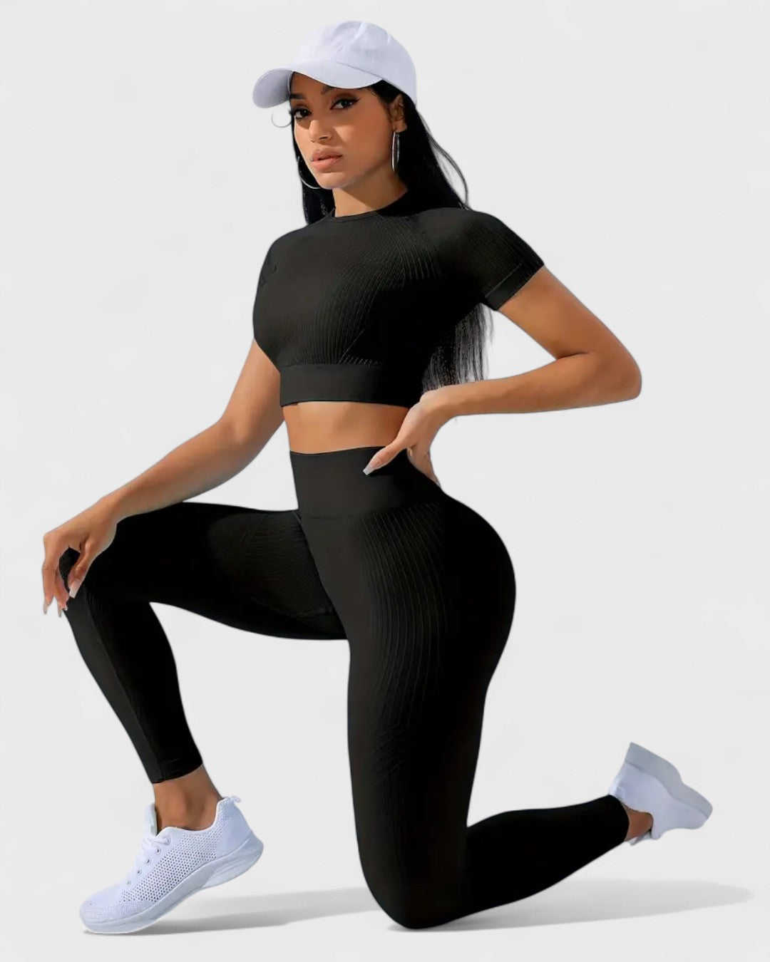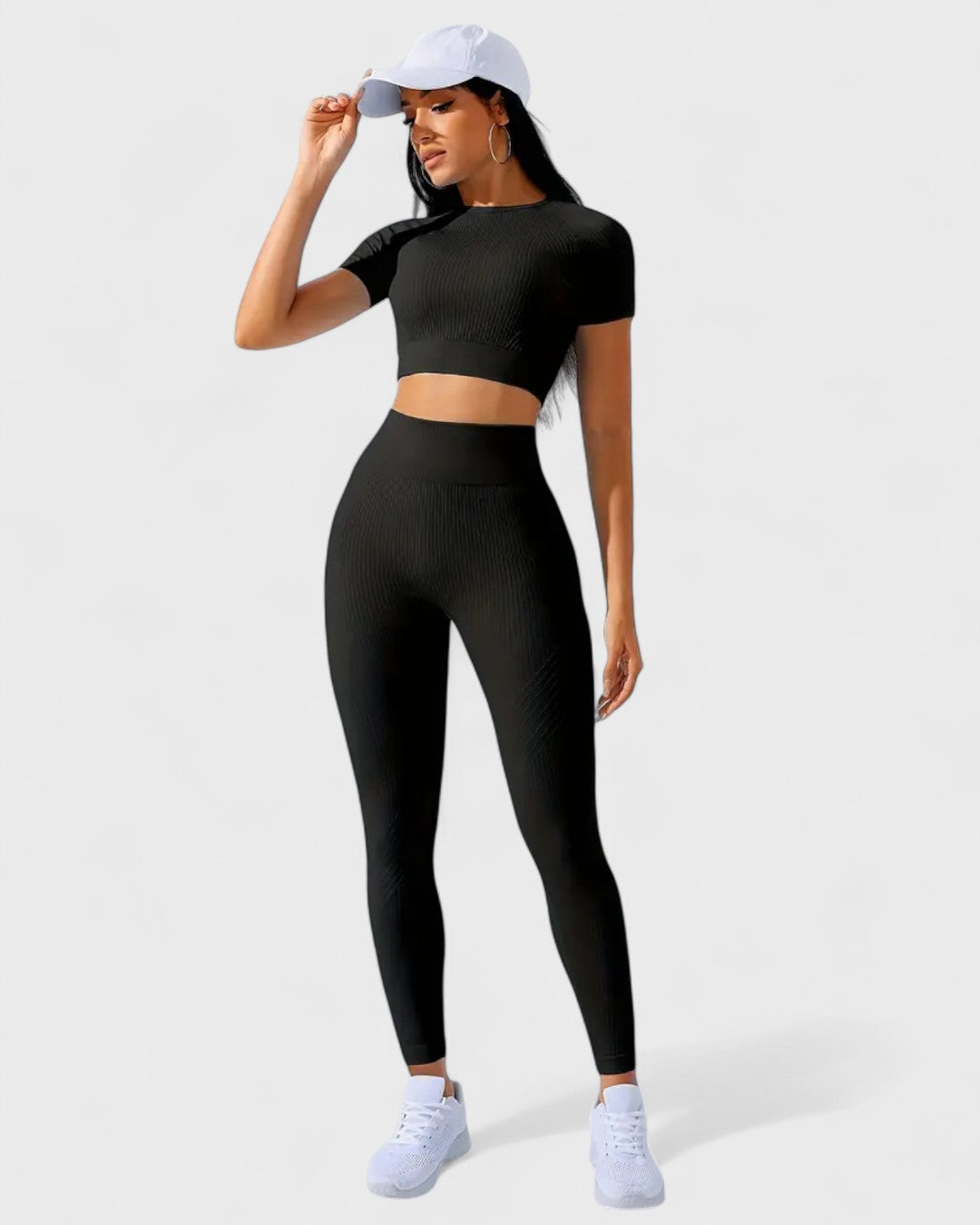 Le top court et ajusté met en valeur les épaules et la taille, tandis que les leggings à taille haute soutiennent le ventre et galbent les fessiers. Ensemble, ils créent un look harmonieux qui inspire confiance.