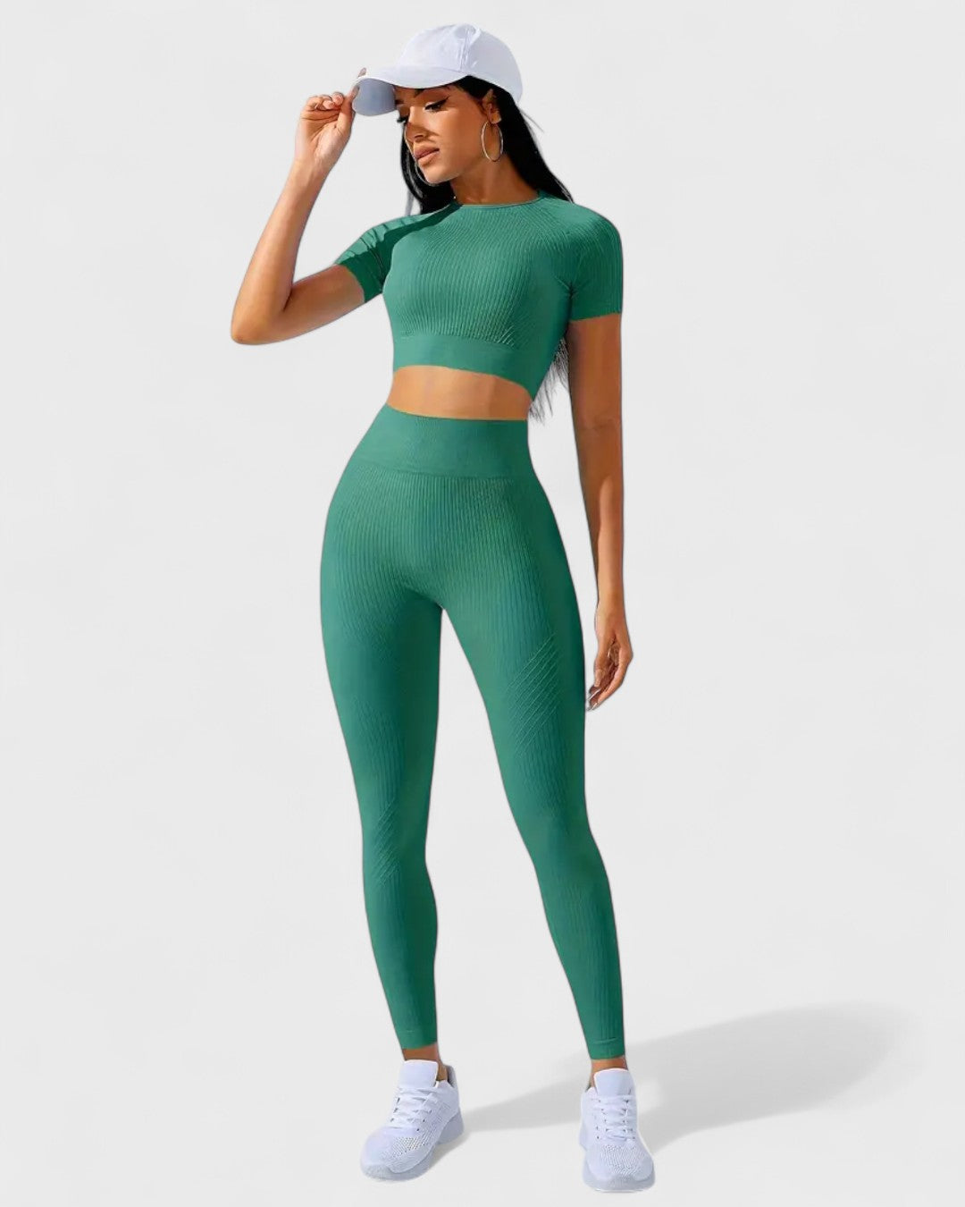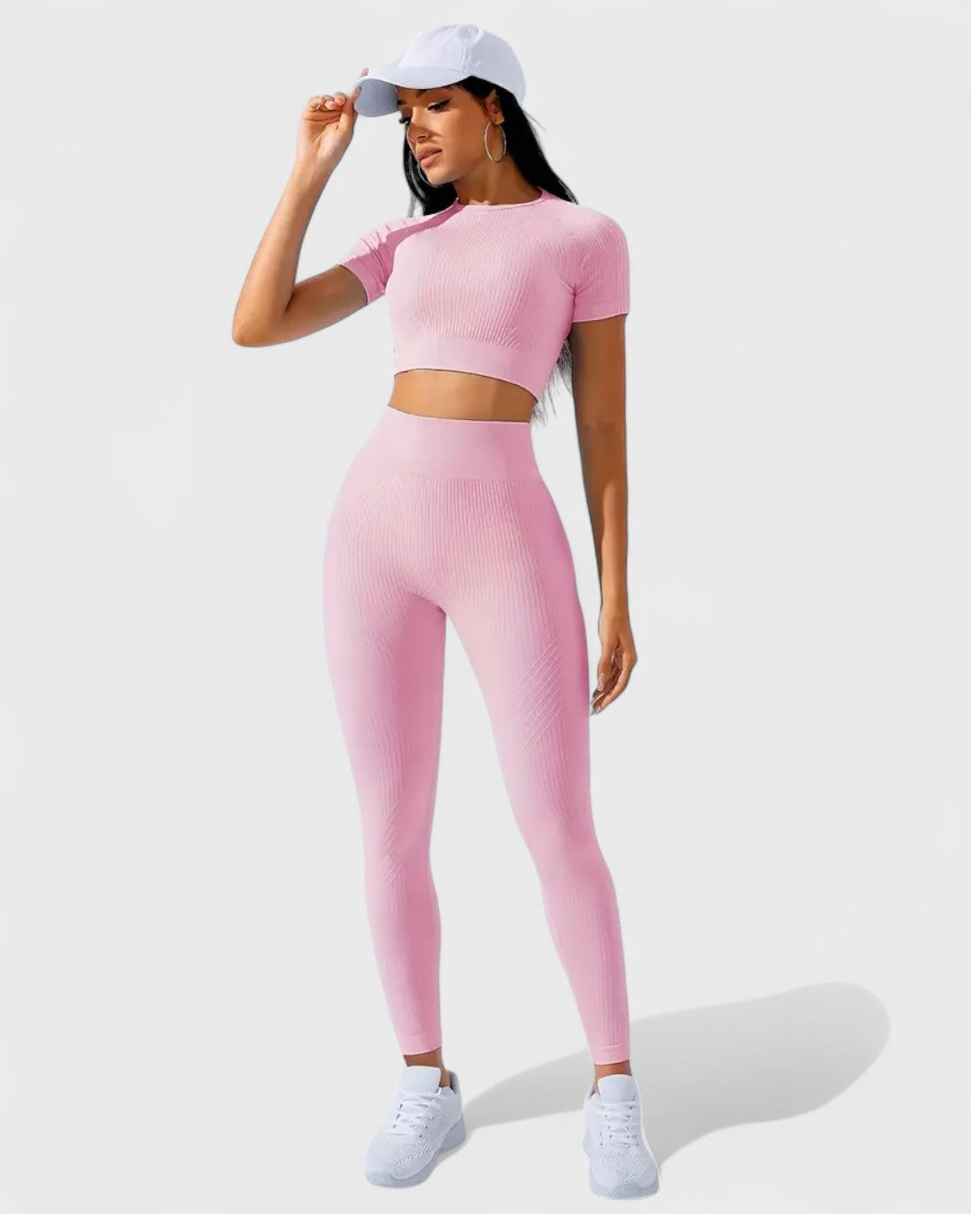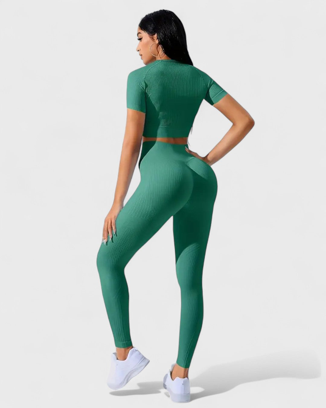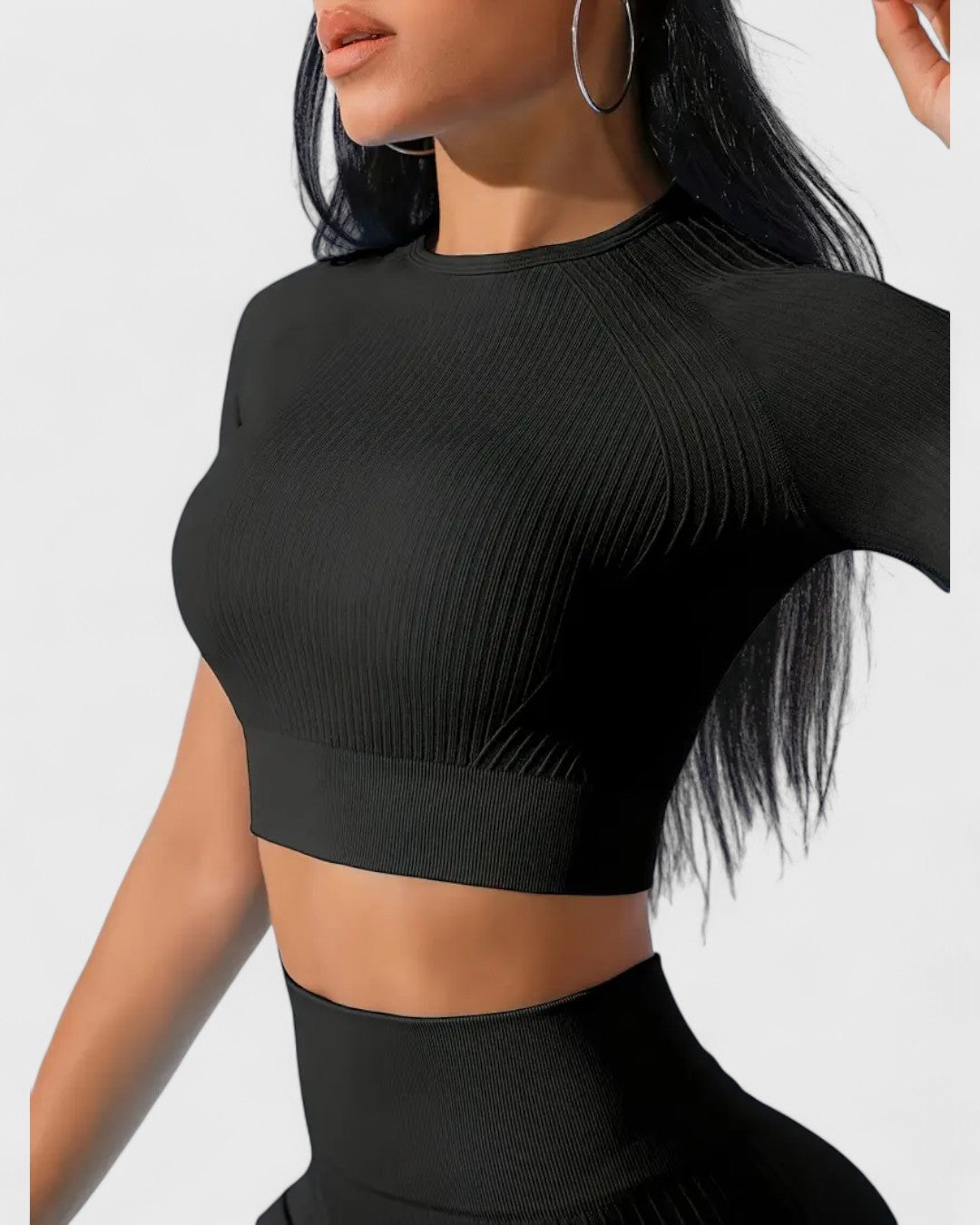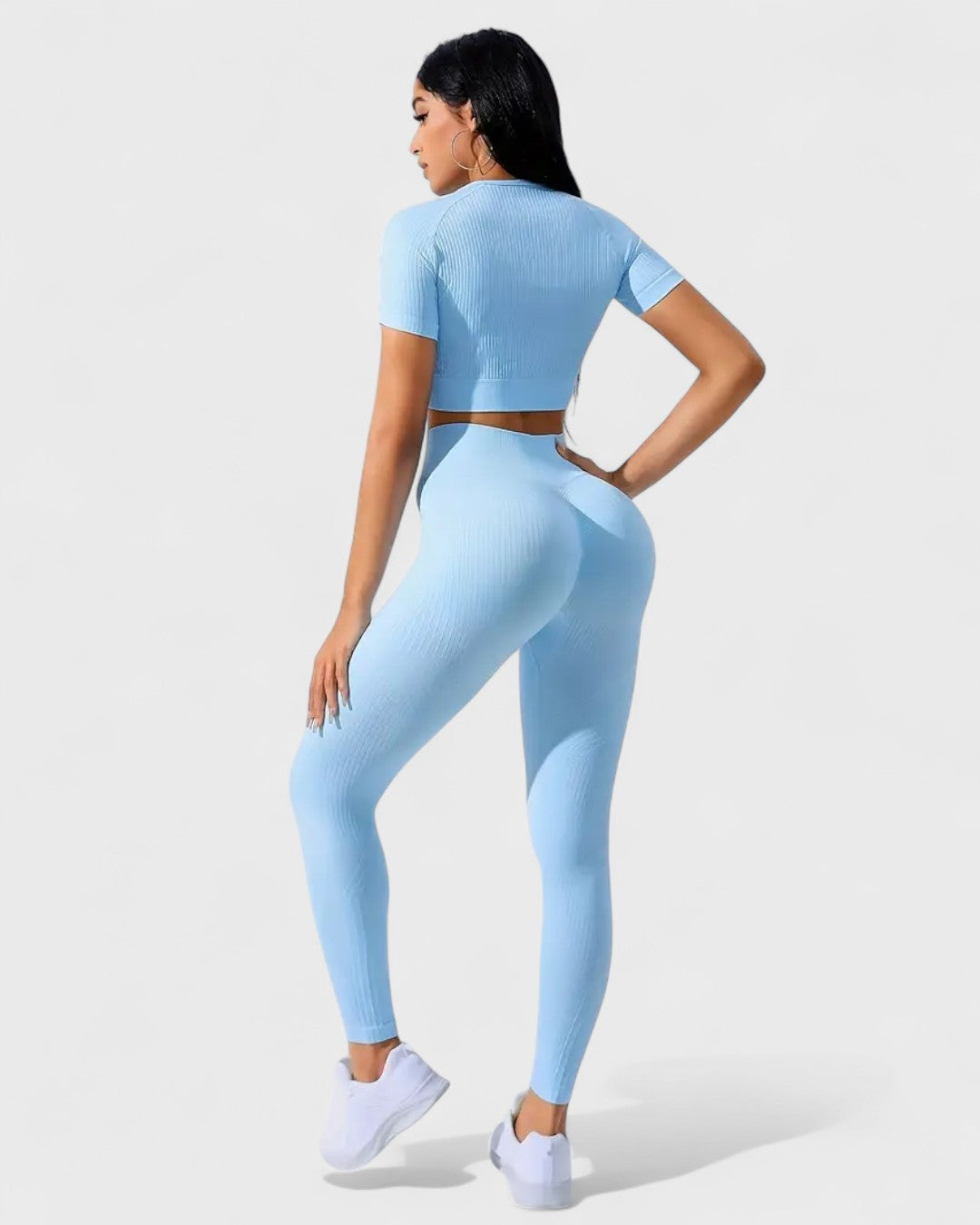 Le top court et ajusté met en valeur les épaules et la taille, tandis que les leggings à taille haute soutiennent le ventre et galbent les fessiers. Ensemble, ils créent un look harmonieux qui inspire confiance.