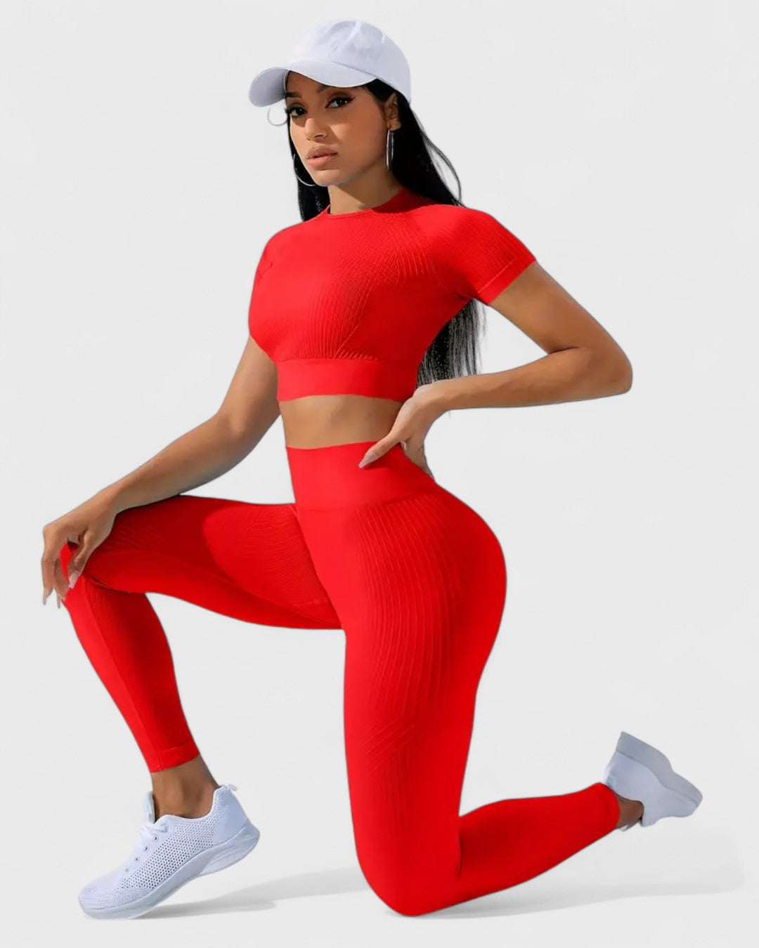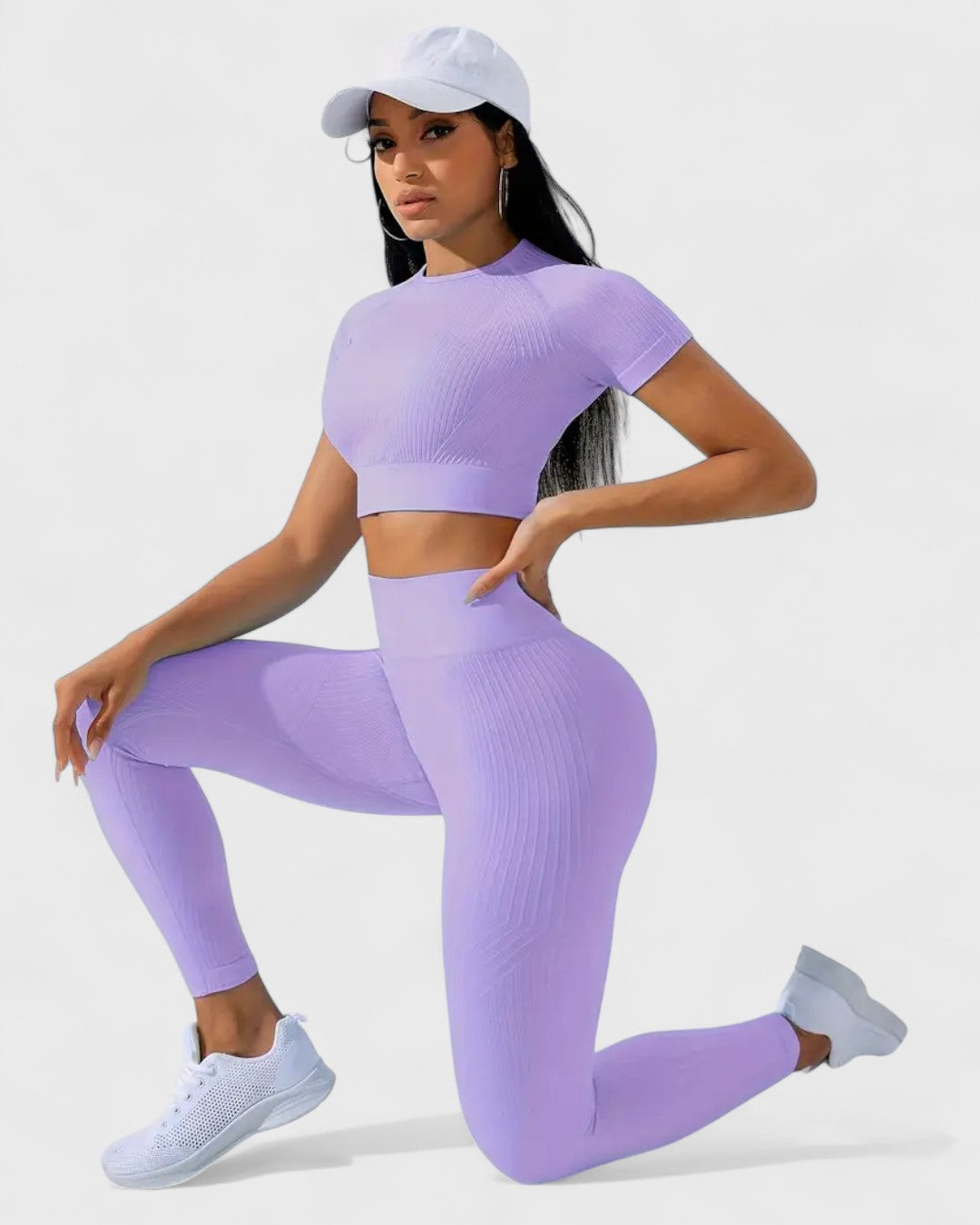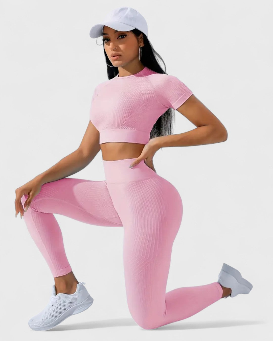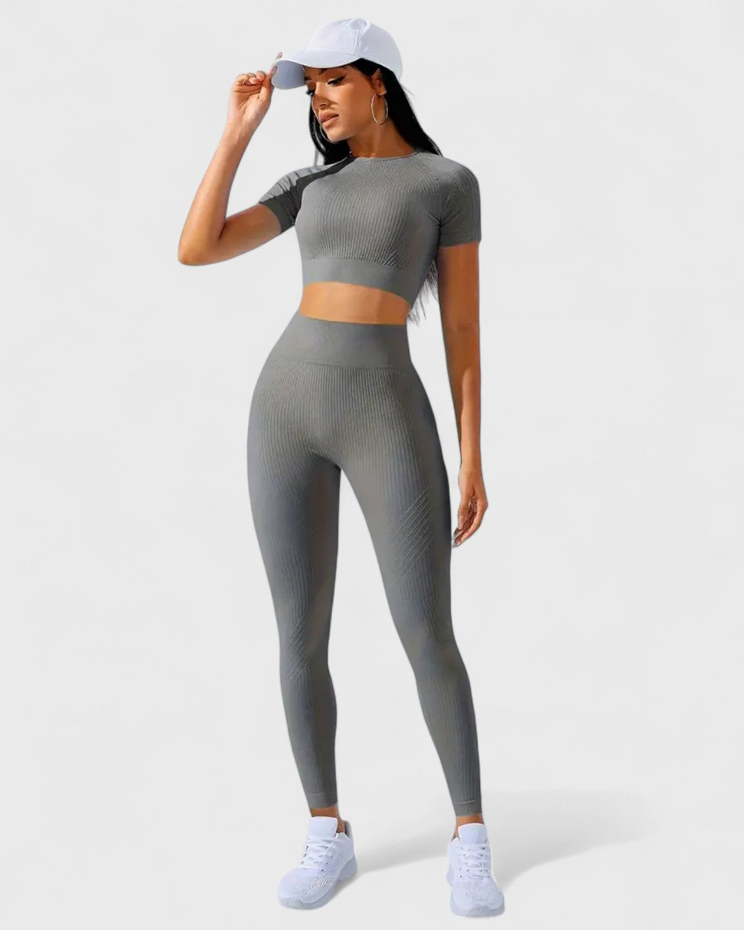Le top court et ajusté met en valeur les épaules et la taille, tandis que les leggings à taille haute soutiennent le ventre et galbent les fessiers. Ensemble, ils créent un look harmonieux qui inspire confiance.