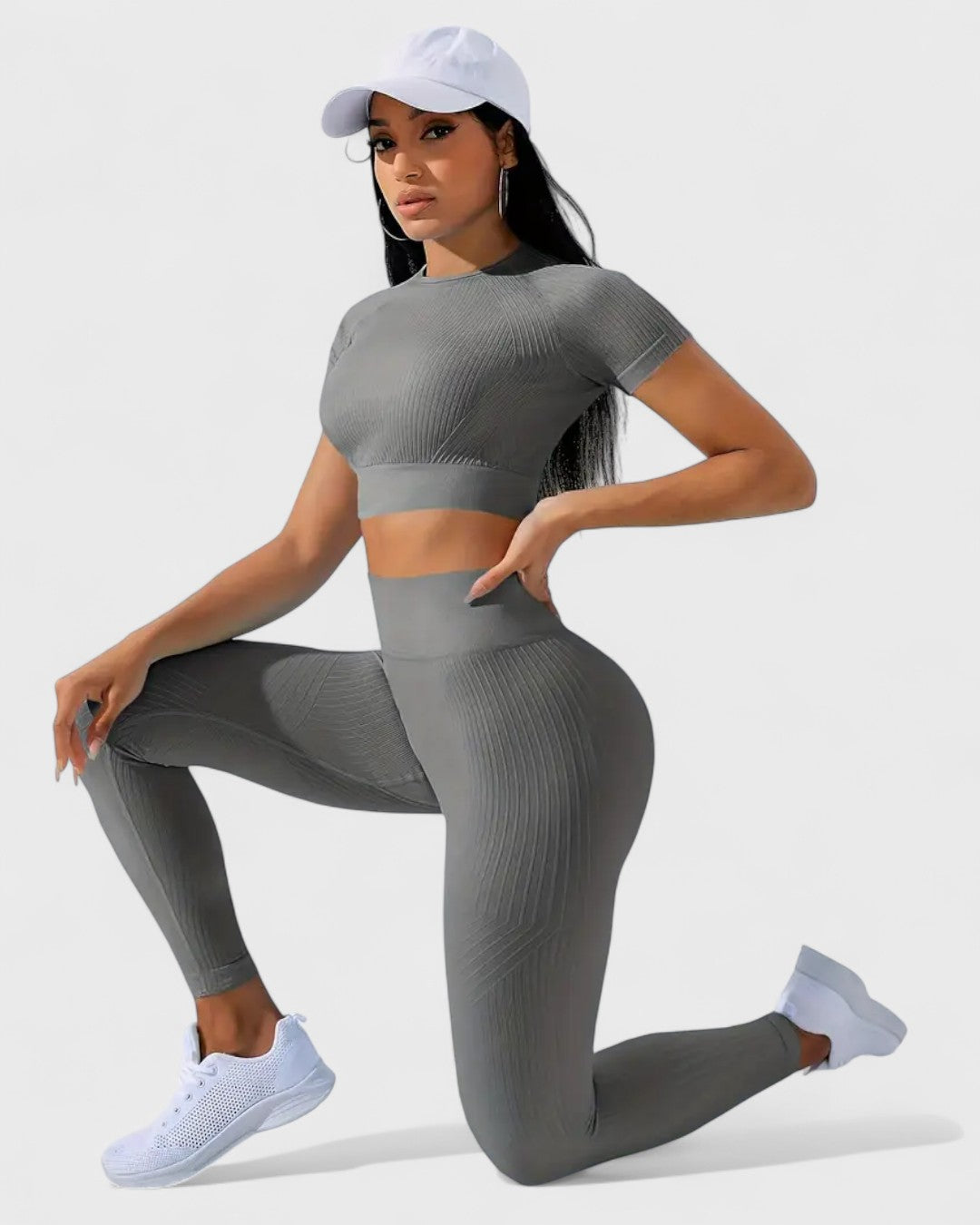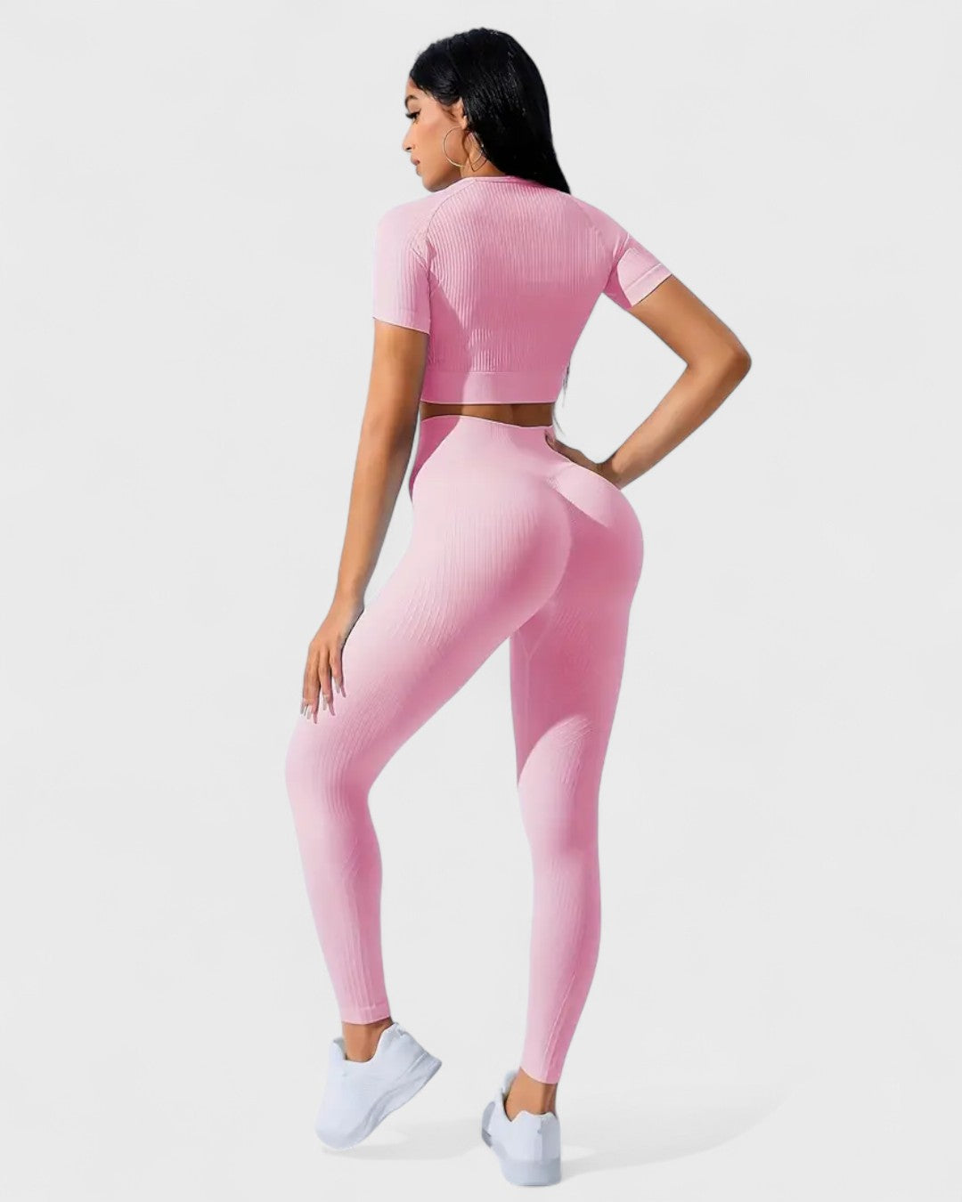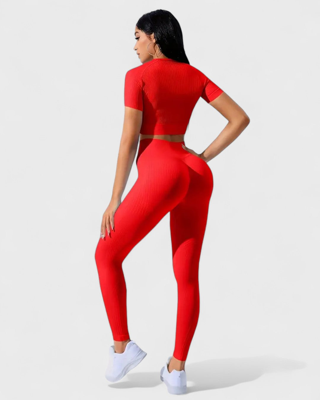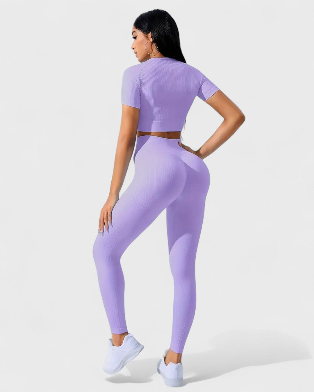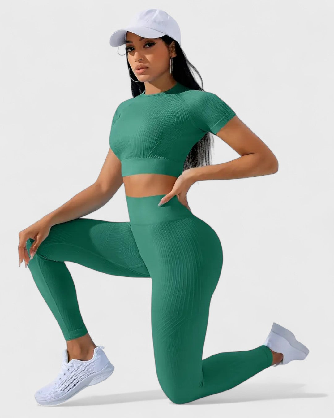 Le top court et ajusté met en valeur les épaules et la taille, tandis que les leggings à taille haute soutiennent le ventre et galbent les fessiers. Ensemble, ils créent un look harmonieux qui inspire confiance.