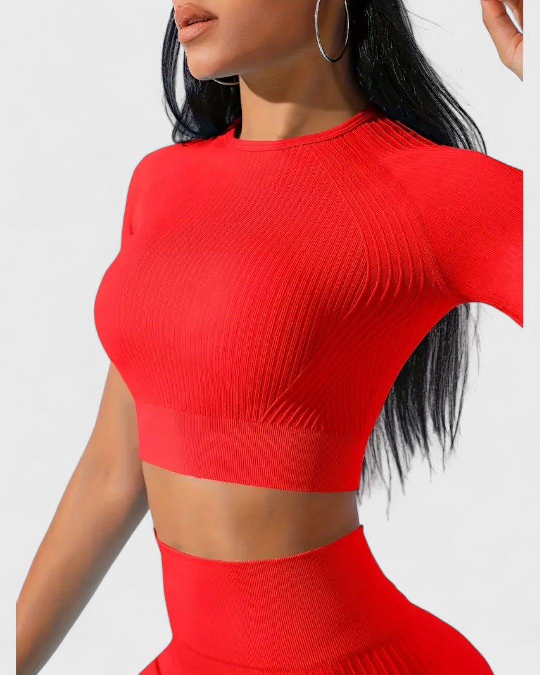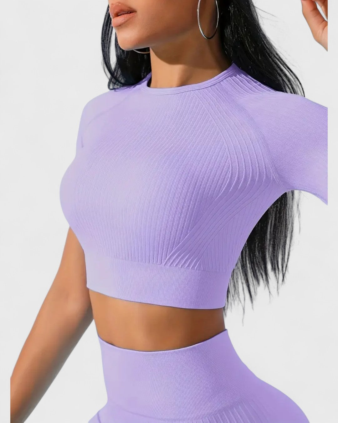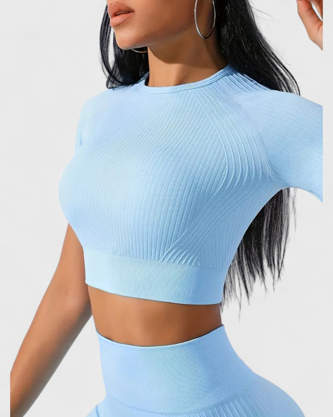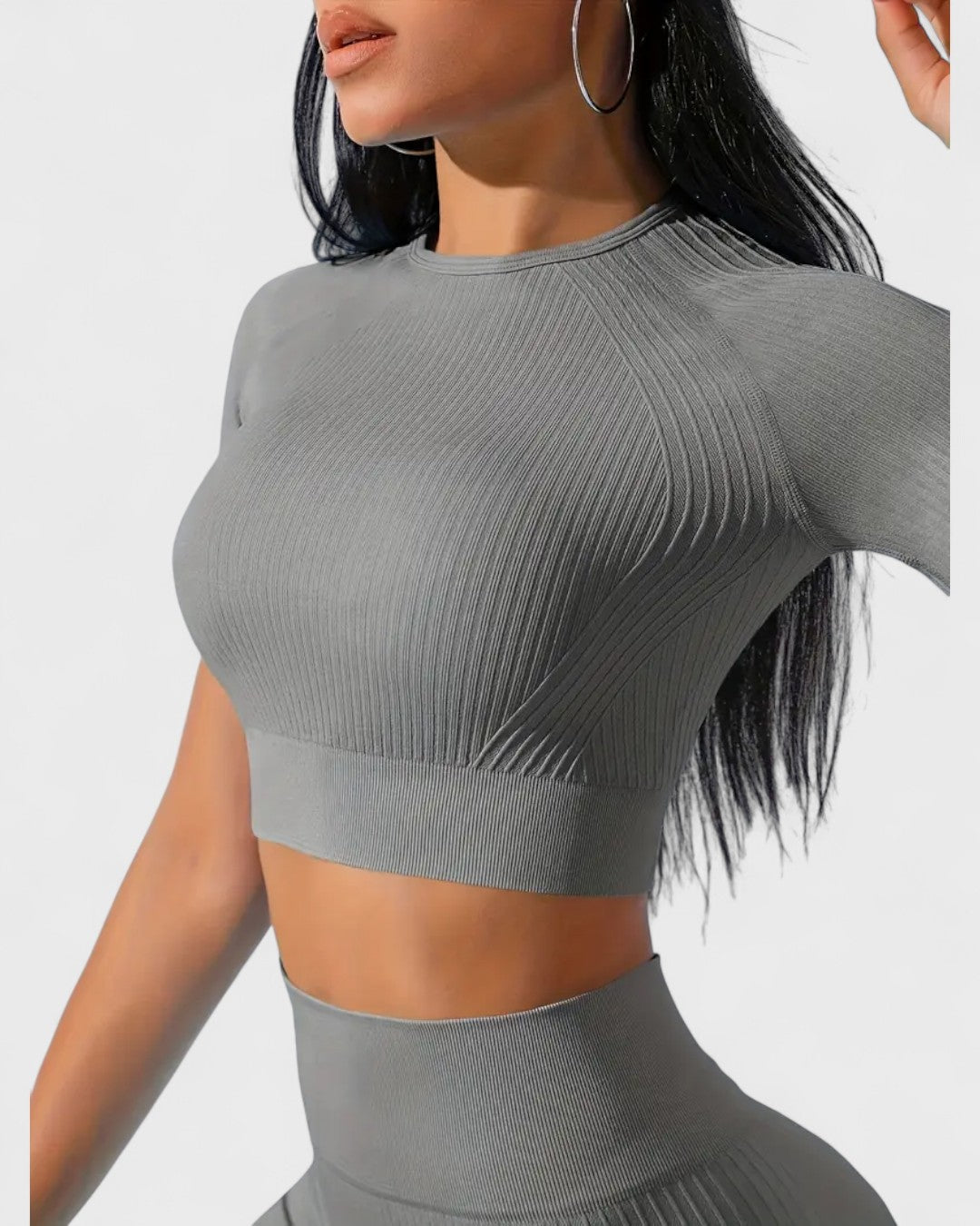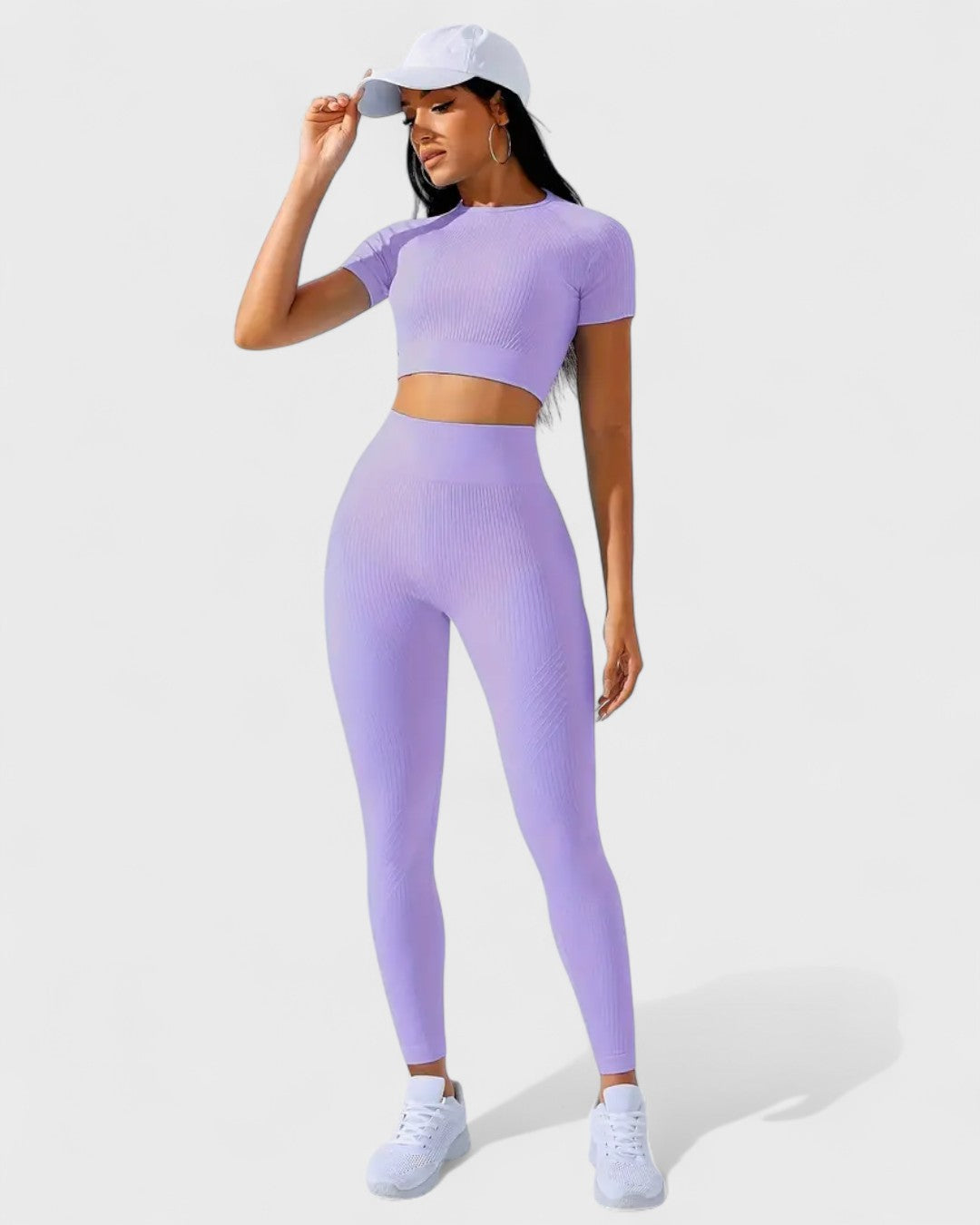 Le top court et ajusté met en valeur les épaules et la taille, tandis que les leggings à taille haute soutiennent le ventre et galbent les fessiers. Ensemble, ils créent un look harmonieux qui inspire confiance.