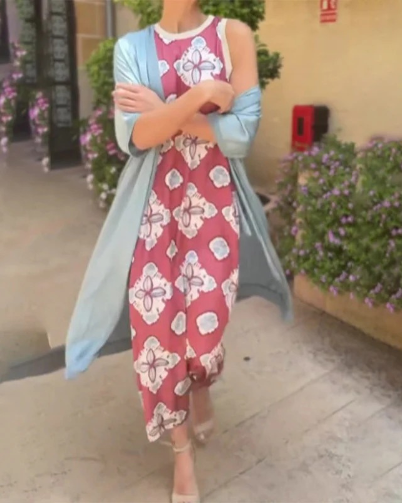 - Elle est accompagnée d'un duster long et uni qui complète parfaitement la robe, offrant une superposition polyvalente et une couverture supplémentaire.